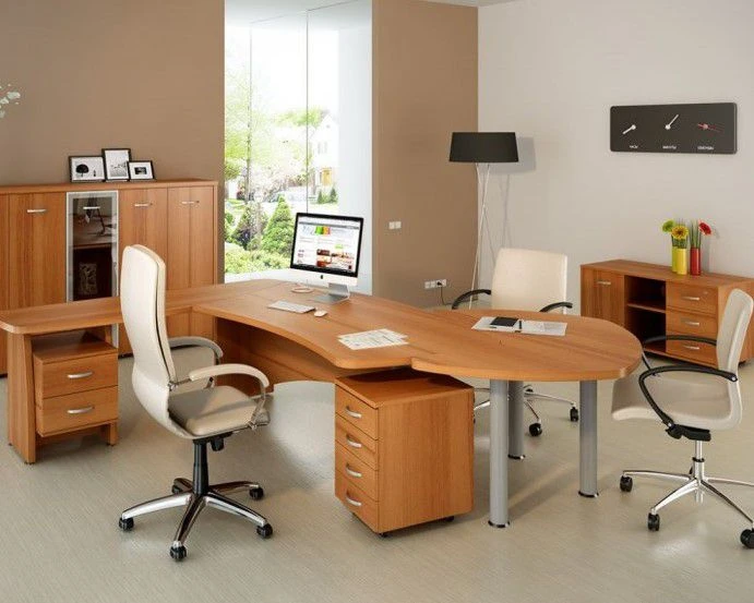 Данная мебель для офиса подойдет для помещений любого размера, ее несложно дополнить другой фурнитурой в случае необходимости – это могут быть даже яркие вещи, не похожие по оттенку на основной стиль. Но лучше всего выглядят дополнительные аксессуары, выполненные в белом, или других светлых цветах. В комплекте присутствую также металлические детали, благодаря которым любая офисная техника будет выглядеть уместно в общем дизайне помещения.