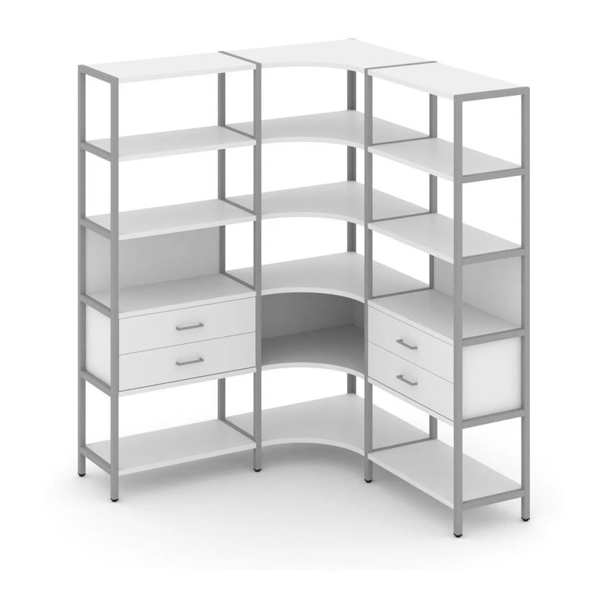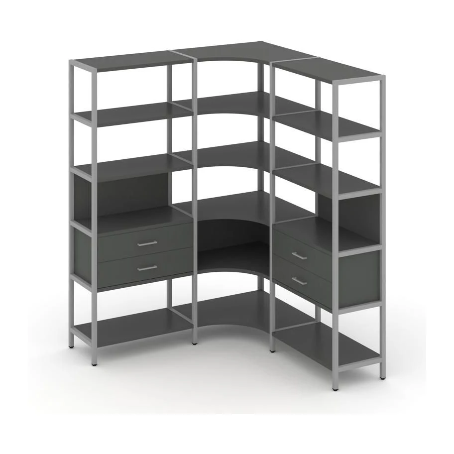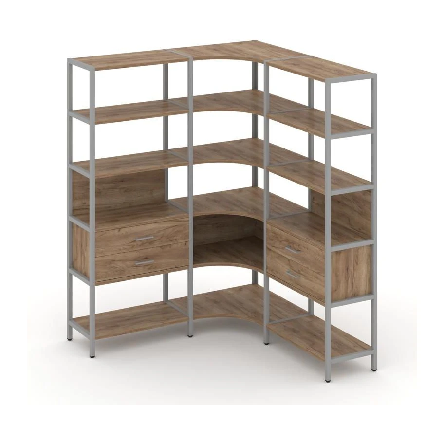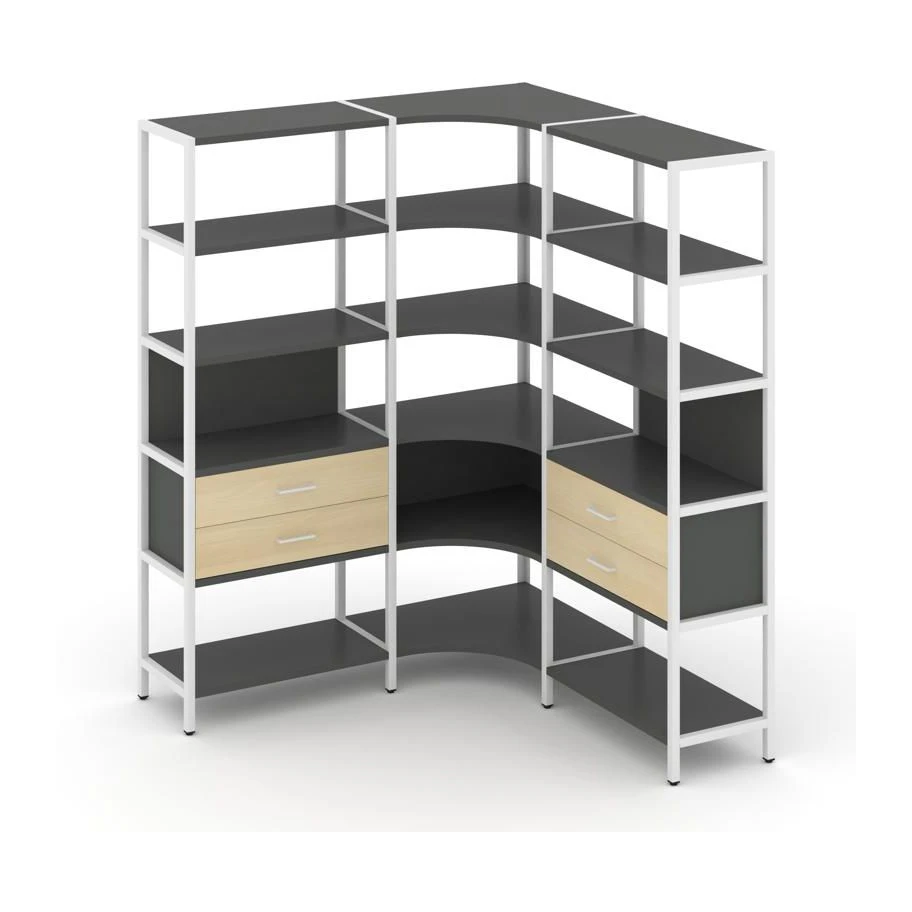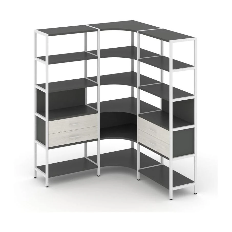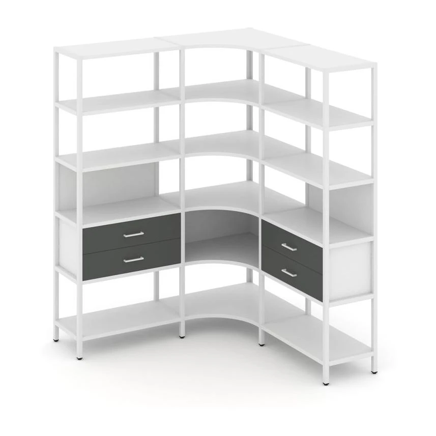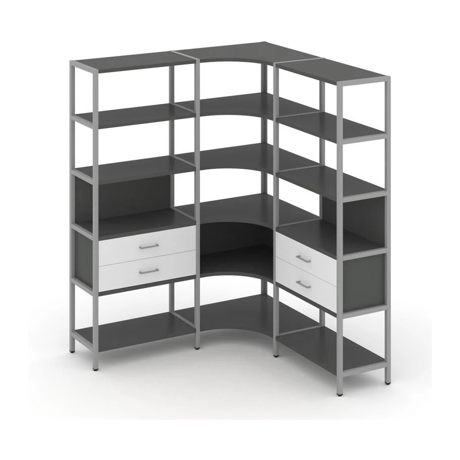 - Трехсекционный угловой стеллаж пятиярусный с ящиками 1590х1590х1980 Шелф Систем / Shelf System