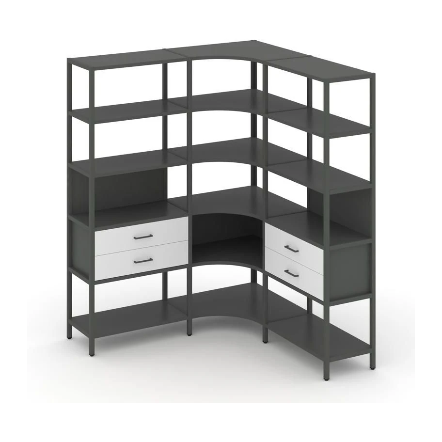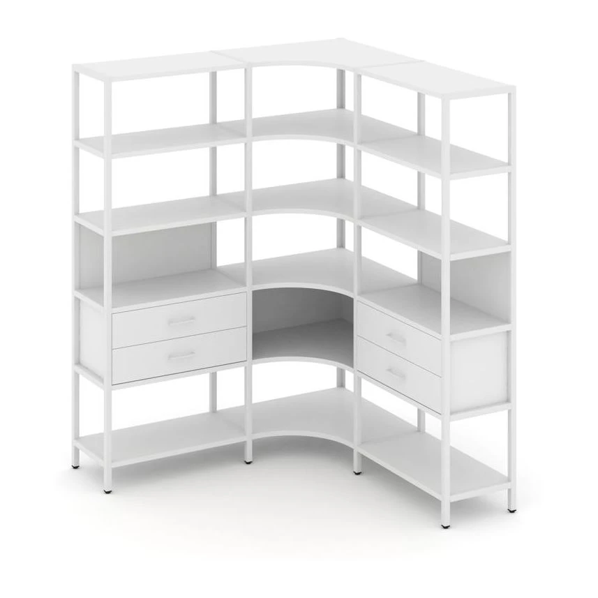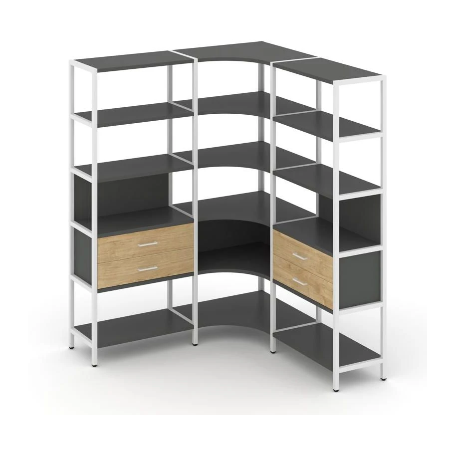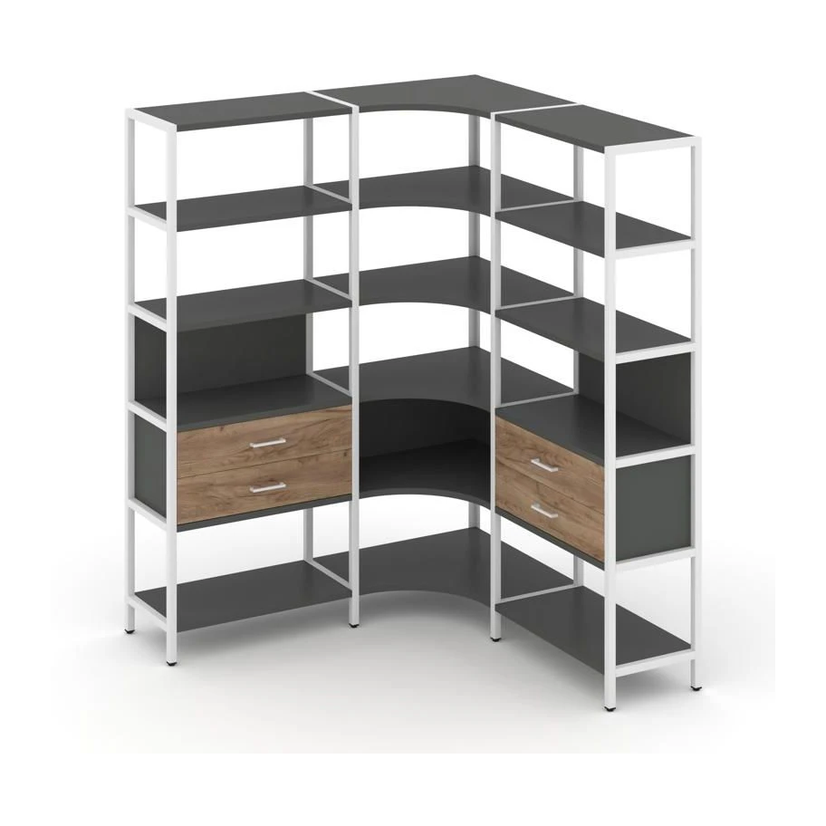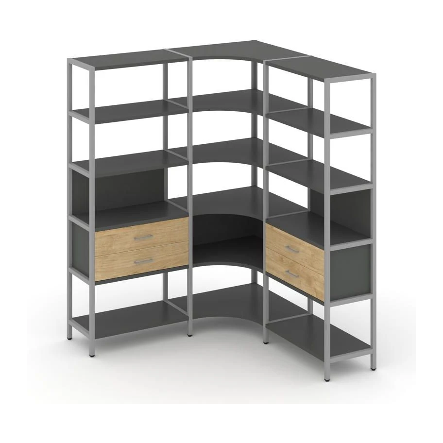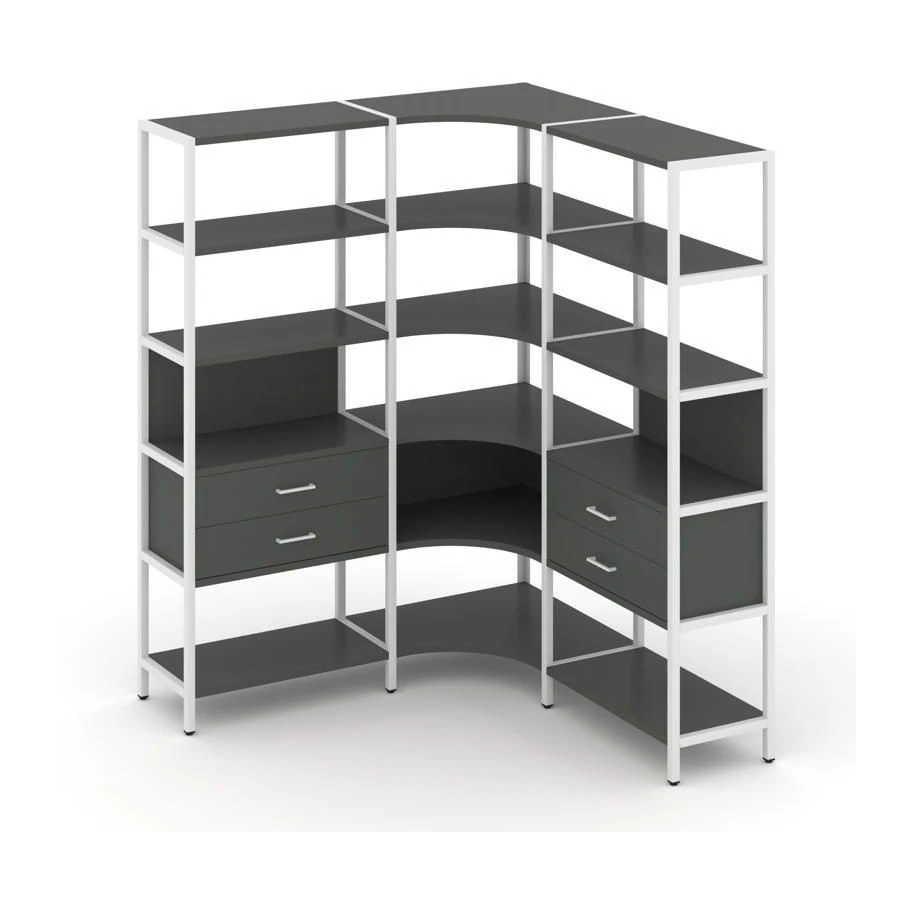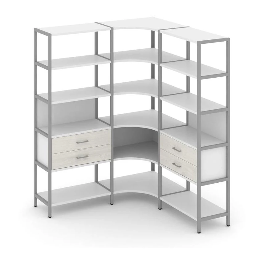 - Трехсекционный угловой стеллаж пятиярусный с ящиками 1590х1590х1980 Шелф Систем / Shelf System