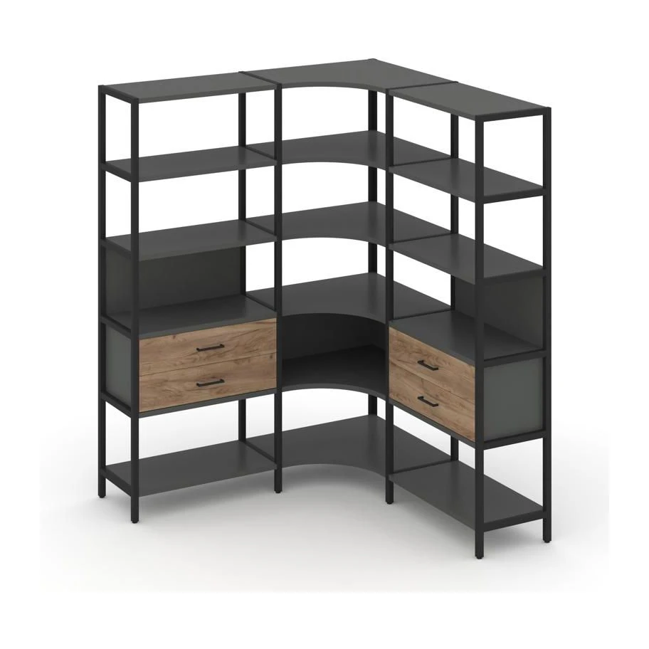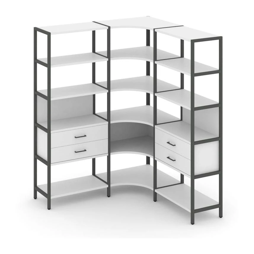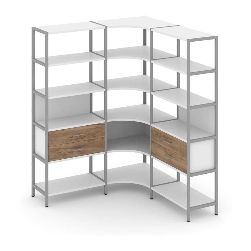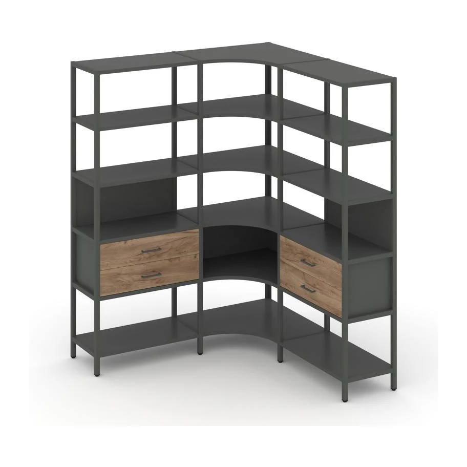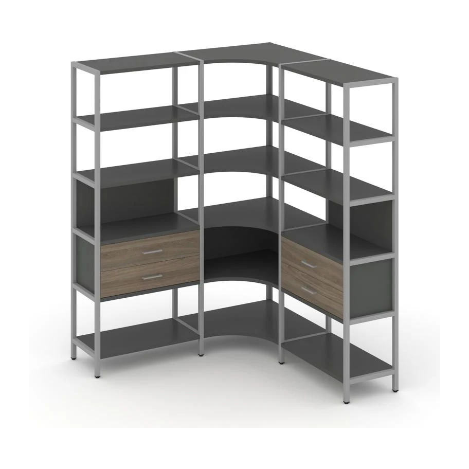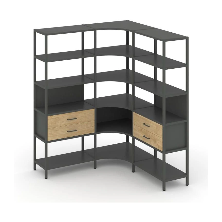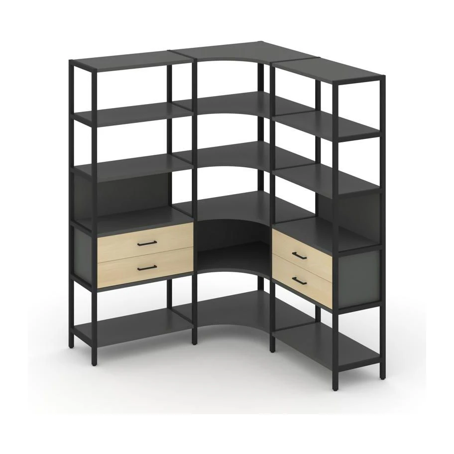- Трехсекционный угловой стеллаж пятиярусный с ящиками 1590х1590х1980 Шелф Систем / Shelf System